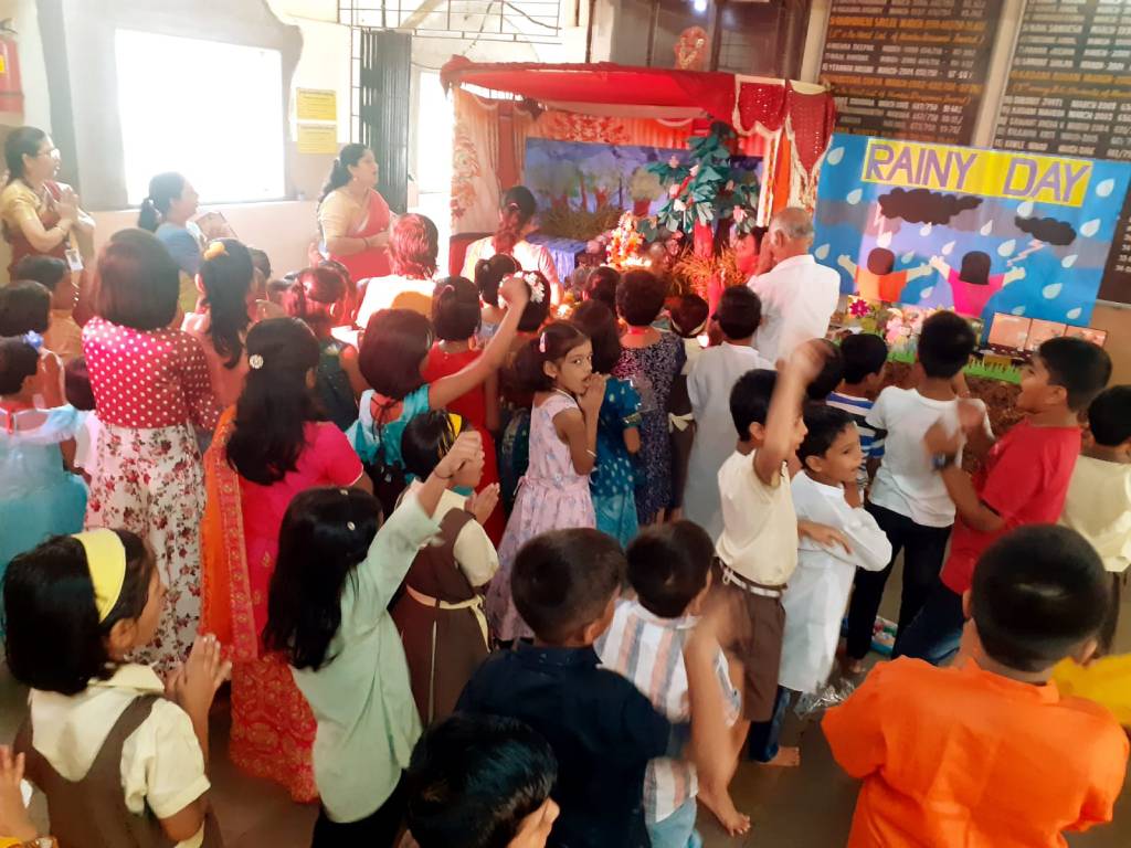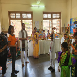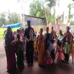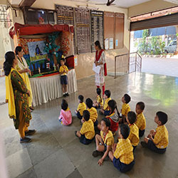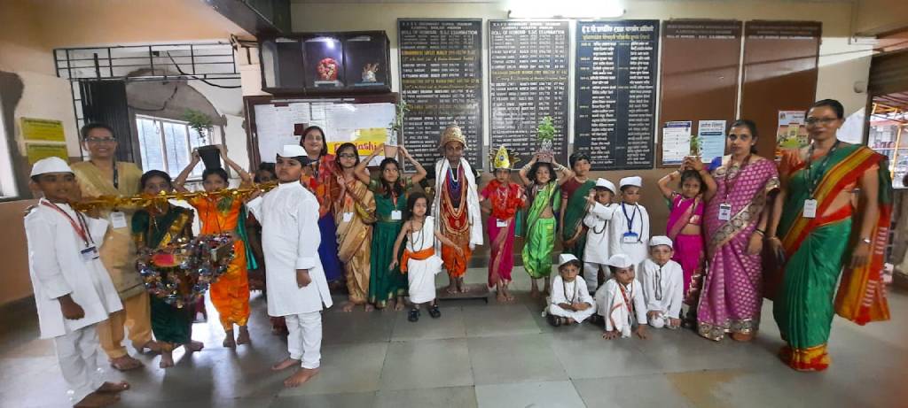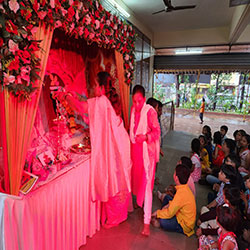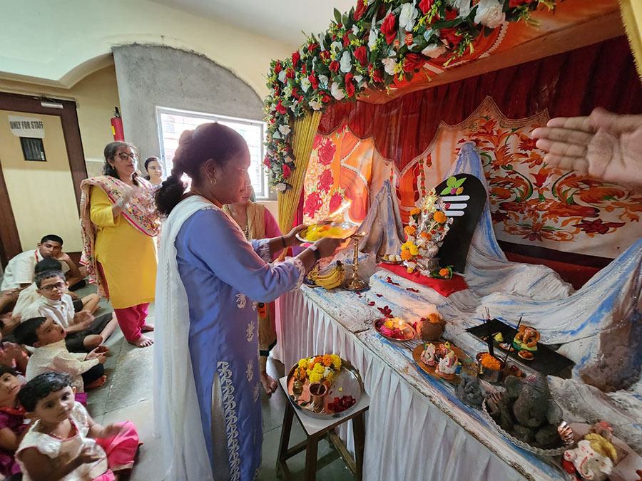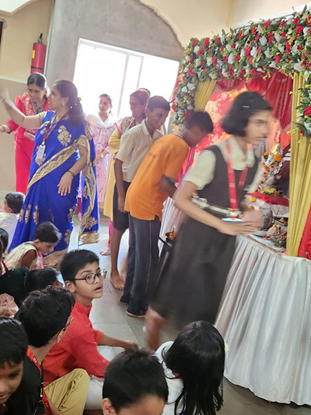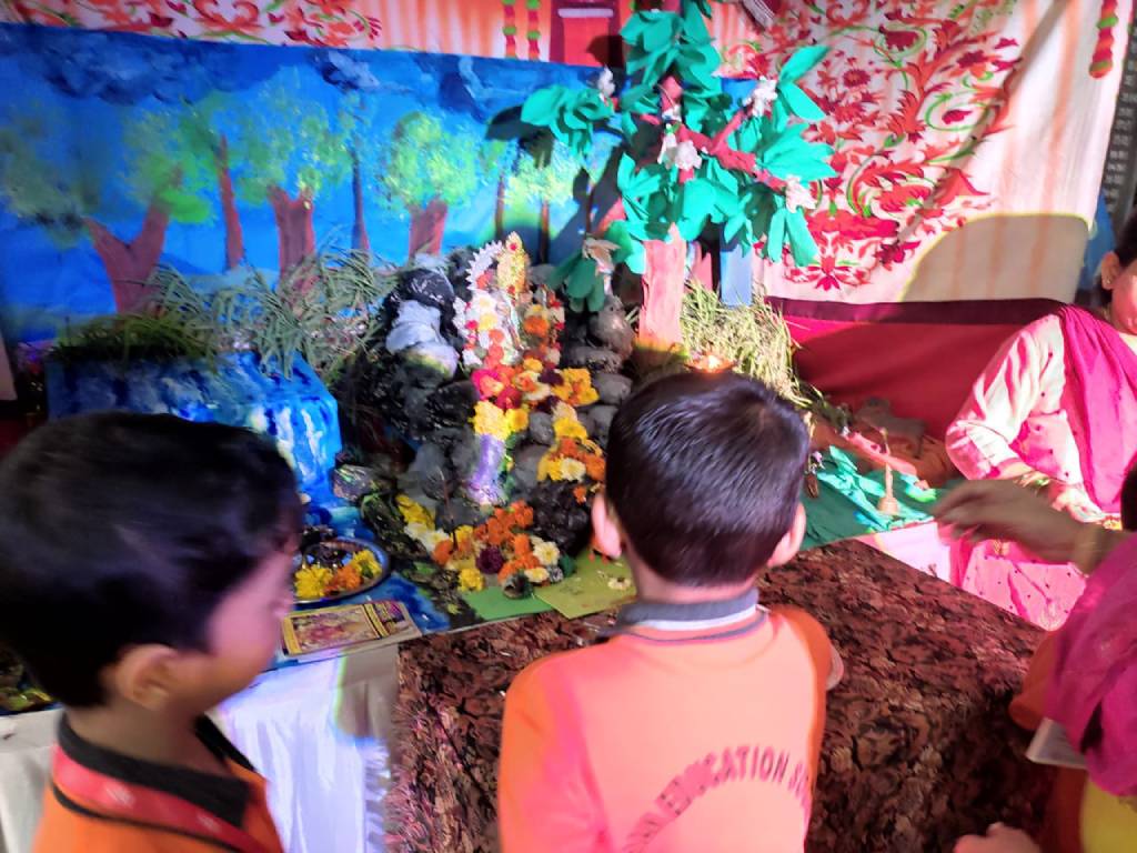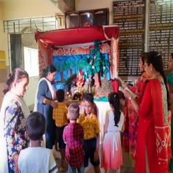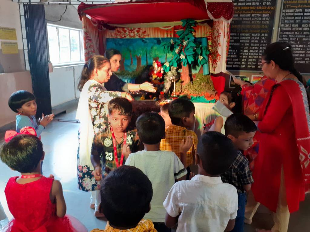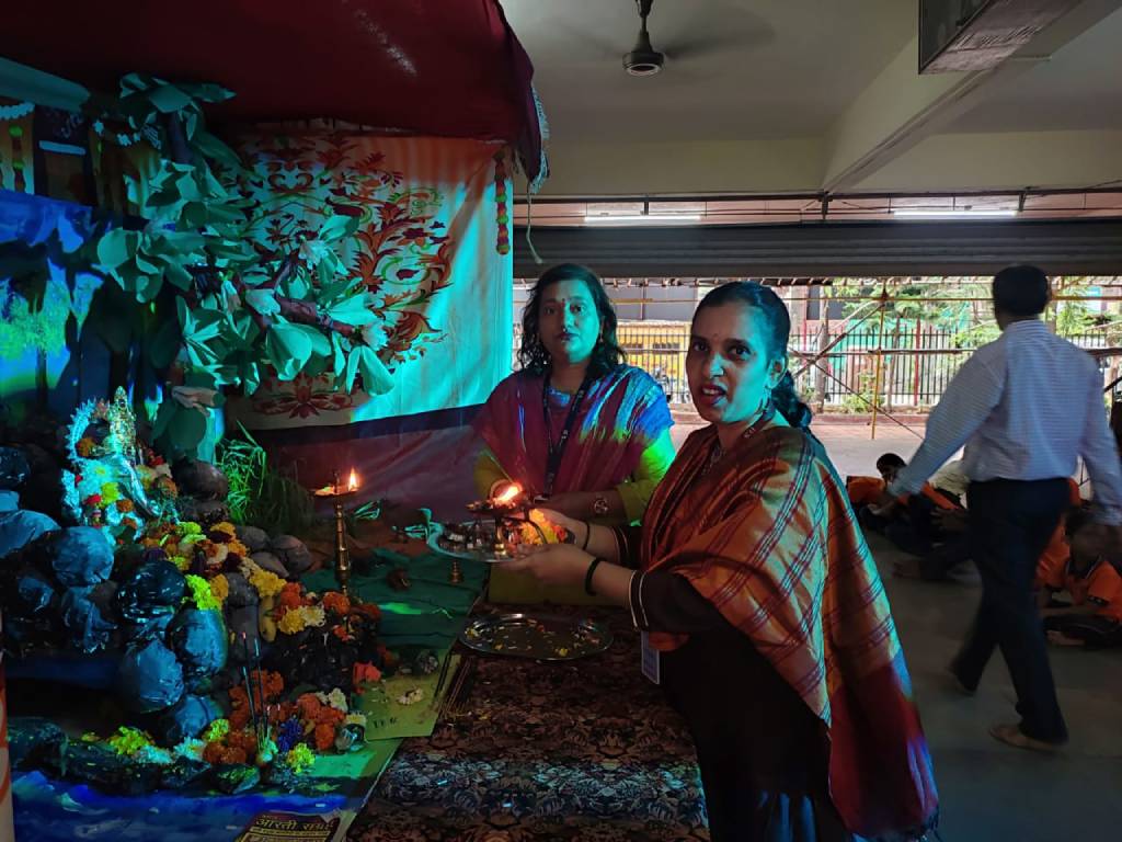 Deep Pooja was celebrated by removing rangoli and lit lamps to mark the beginning of Shravan month. Information was given by teachers. Shlokas were recited.