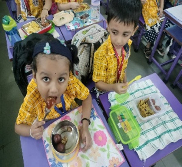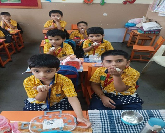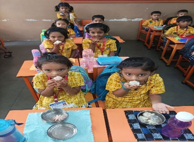 The Shravan feast was observed from 04.08.2025 to 08.08.2025. Children were asked to bring mouth watering festive dishes in their tiffin. According to the time table given for each day, children enjoyed eating the festive dishes like sheera, modak, gulab jamun, puran poli during the lunch break.