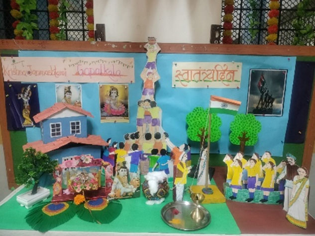 Krishna is the Hindu god of compassion, protection and love. Lord Krishna's birthday is celebrated as Janmashtami. In IES. CPV., Gopal Kala was celebrated on 13.08.2025, with great devotion and reverence. The tiny tots of Kinder Garten were looking very colourful dressed as Krishna and Radha. A project on Krishna janmasthami and gopal kala was displayed. Children enthusiastically gathered in the assembly room and danced to the tune of garba and dahi handi music. Later the dahi handi pot was hit by one of the little Kanha which was the main highlight of the day. Sweets were distributed as prasad.