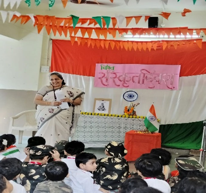 Our headmistress Mrs. Sumedha Nawathe briefed about the sanskrit Language as it is called as dev vani and recited an action song – Yanam dhavti Bhup ,bhup,bhup… children repeated after her with actions and enjoyed a lot. She also introduced numbers 1 to 10 which children repeated after her. Some children recited various shlokas with great enthusiasm. Overall, the sanskrit day celebration in the KG section was joyful, educational and inspiring ,leaving a lasting impression on the tiny learners.