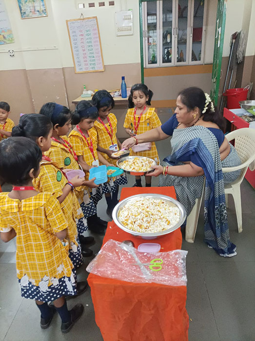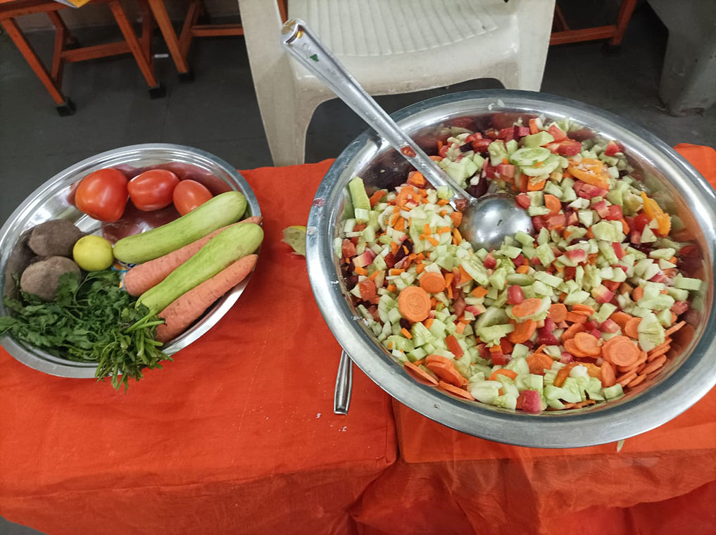 During healthy food week we have community lunch during tiffin time to promote awareness about the importance of eating nutritious and balanced meals. Children are also encouraged for healthy eating habits. According to the table mentioned in the monthly programme children brough t and prepared fruit salad, vegetable salad, sprout chat, and sukhi bhel.