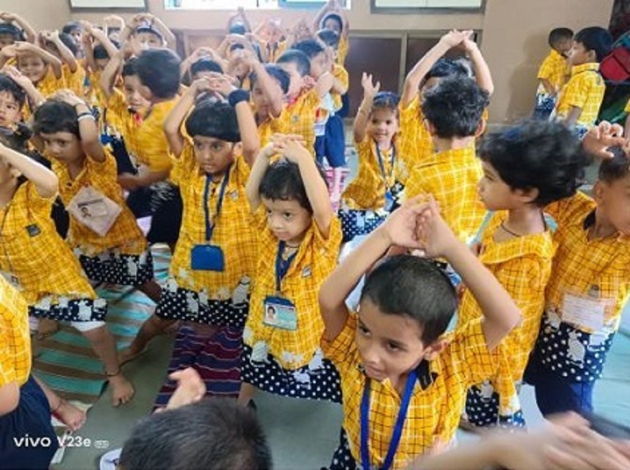 In IES CPV KG., it was organized in KG premises. Since Yoga increases strength, flexibility and coordination, age appropriate exercises were performed by the teachers and KG tiny tots. Children enthusiastically participated in the Yoga session.
