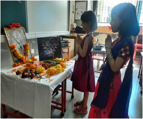 Dassera was celebrated by performing Saraswati Poojan in each class. Children came in colourful dress. Later children played garba and bhondla.