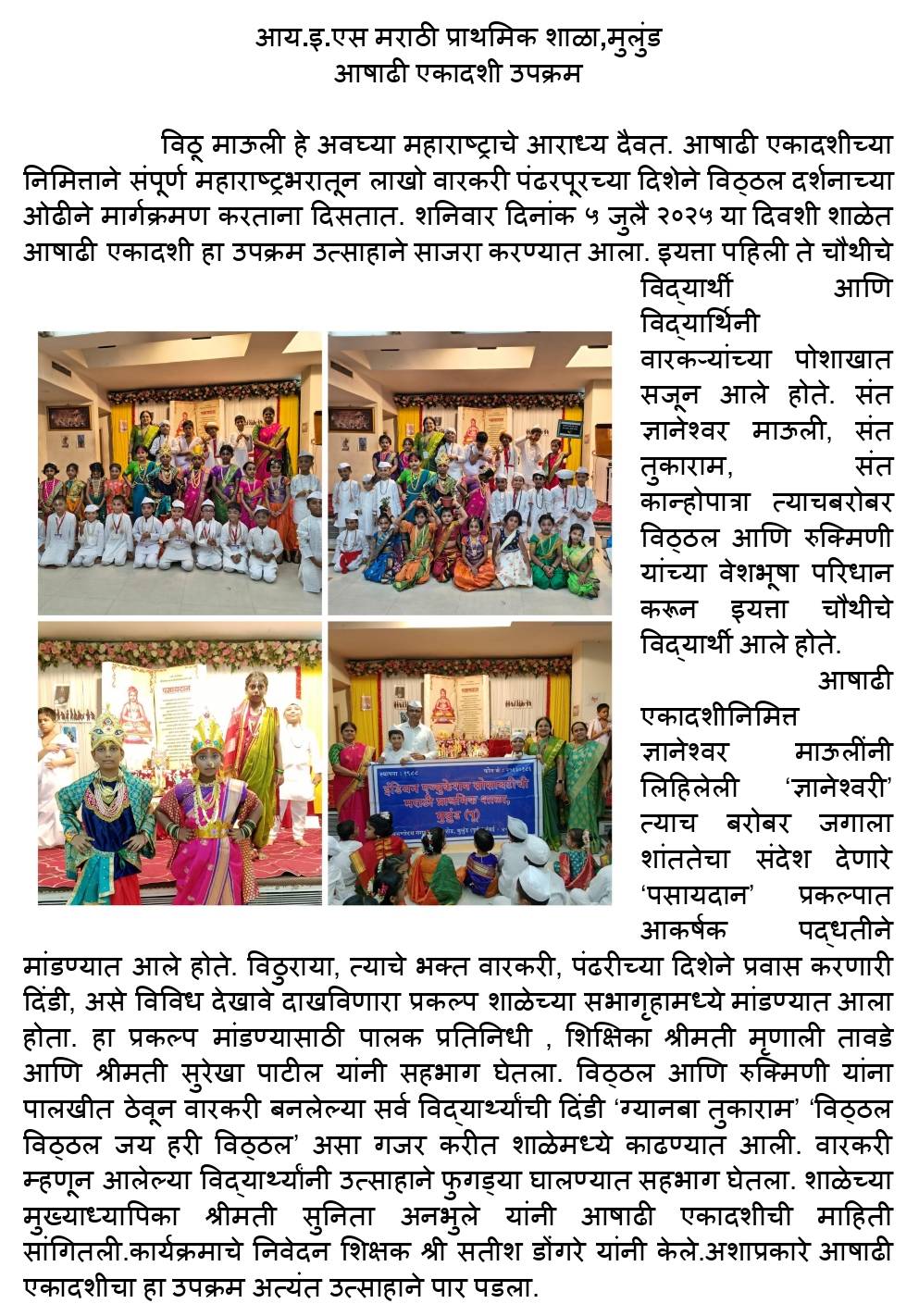 Ashadhi Ekadashi was celebrated in our school on 5th July 2025 with great devotion and enthusiasm. A special project display and a vibrant procession marked the occasion. Students from Std. I to IV, dressed as Warkaries, saints, and divine figures like Vitthal and Rukmini, added charm and cultural richness to the celebrations.