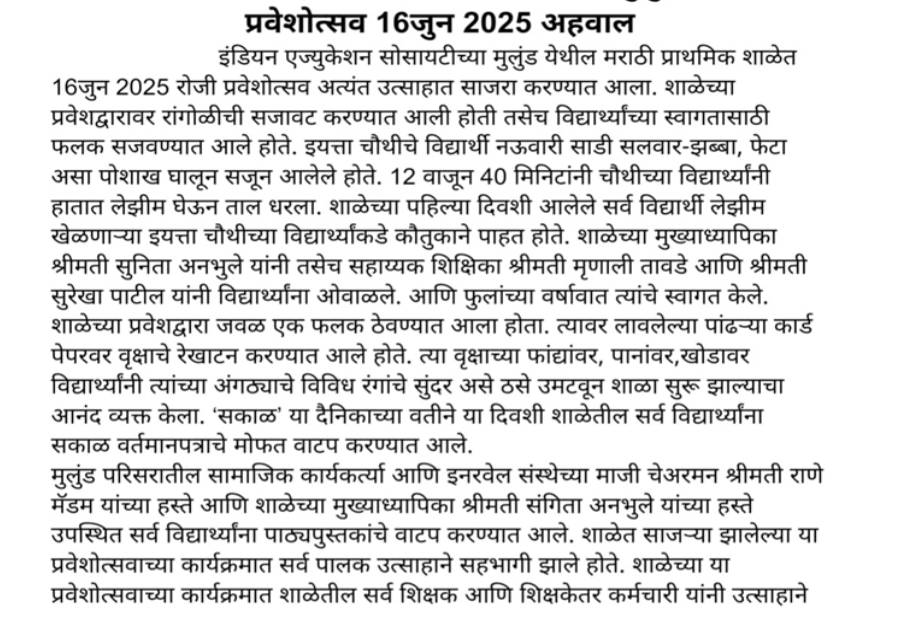 The school reopened on 16th June 2025. All students were warmly welcomed at the gate by Headmistress, Smt. Asha Jadhav, along with the teachers and PTA members. Class teachers greeted the students cheerfully by presenting them with welcome cards. Each student was invited to choose a greeting gesture such as Namaste, a handshake, or a high-five.