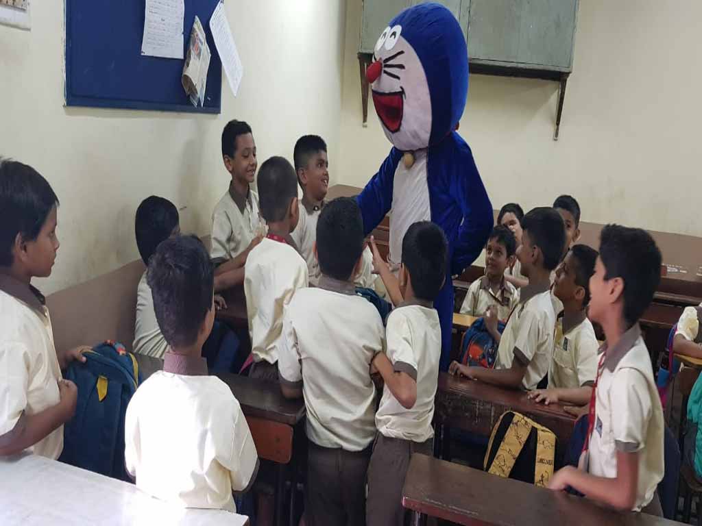 To make them feel welcome and happy IES K.G, Balodyan & English Medium Primary School gave them a surprise by arranging a Doremon mascot. The mascot interacted with kids and shake hands with them. He explained to the students how school days are the best days of life and attending school is essential. He also performed dances on songs thereby making the kids realize that school is fun and they can look forward to it every day.