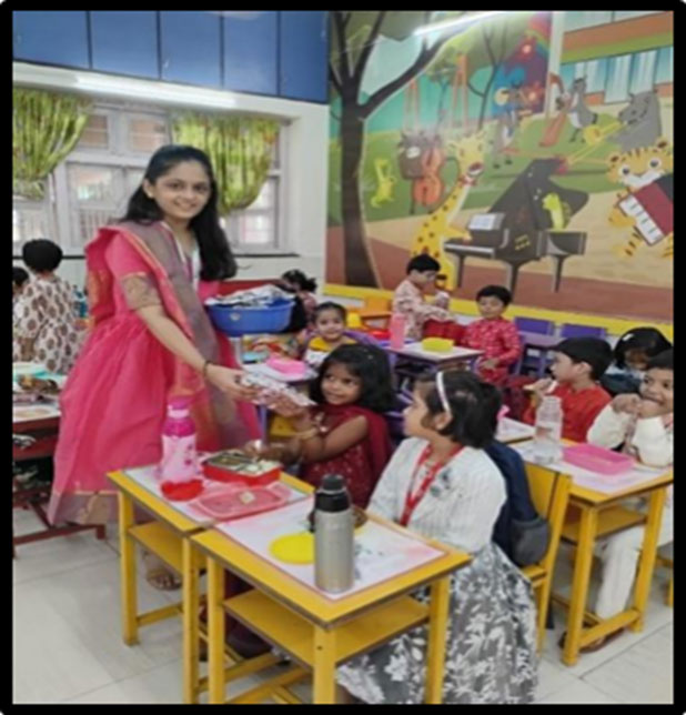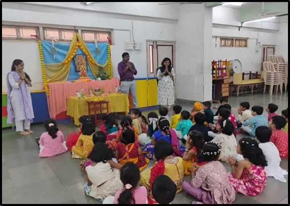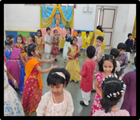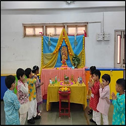 Dussehra was celebrated with great enthusiasm in school. The teachers explained the significance of the festival, highlighting the victory of truth over evil. The little ones offered flowers and incense sticks to the Goddess with devotion. The celebration concluded with joyful dancing and cheerful participation by the children.