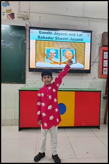 An informative talk was conducted by the teachers on the Father of the Nation, Mahatma Gandhi through a PowerPoint presentation, children learned about his struggle for India’s freedom and also about Lal Bahadur Shastri’s simplicity and values. Both great leaders were remembered and honoured as children shared stories about their lives.