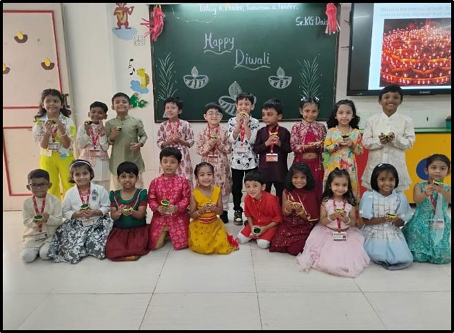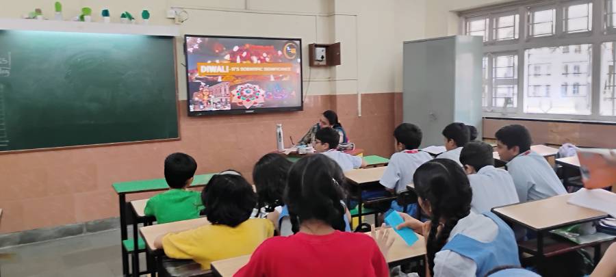 On 14th October 2025, an informative video on Diwali was shown to students of Standards I to X to create awareness about this vibrant festival. Diwali, known as the "Festival of Lights," symbolizes the triumph of light over darkness and good over evil.The video showcased Diwali customs such as lighting diyas, creating colorful rangoli, wearing new clothes, exchanging gifts and sweets, and celebrating with prayers and festive feasts, providing students with an engaging and informative insight into the cultural significance and joyous spirit of the festival.”
