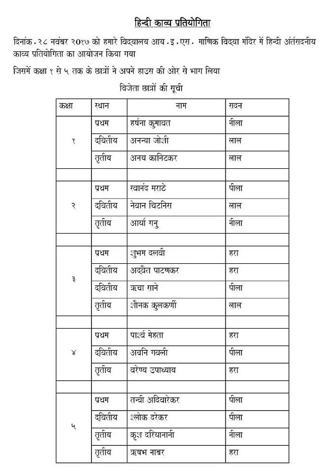 A variety of events were organized for different classes.In Std I , each child was asked to introduce themselves in Hindi. against Sharon English School, Mulund West.