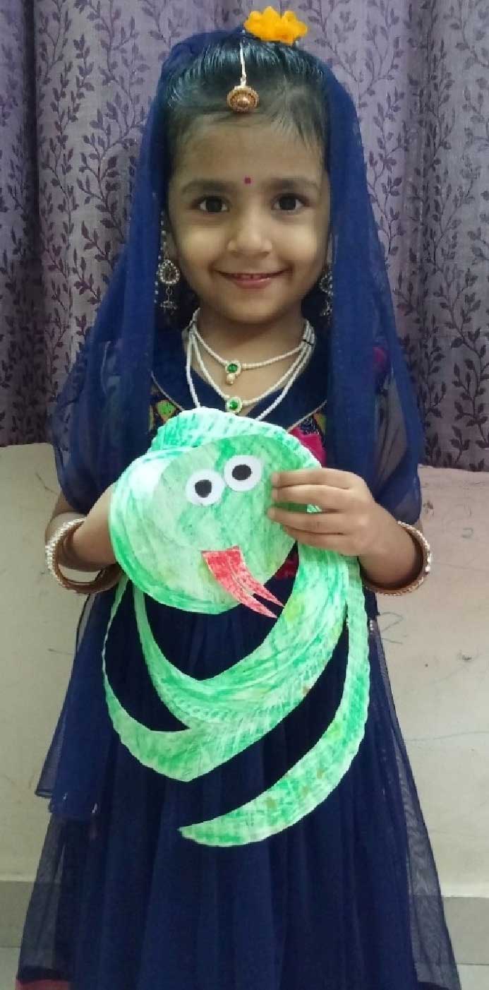 Nag Panchami festival was celebrated virtually. Children learnt about this festival through the celebration video in which even students from the kindergarten participated and spoke confidently. Art and craft activities marking this festival were carried out both in the live and recorded sessions. Sr. KG students made snakes through the activity of paper folding. Art activity of using bubble wrap on a rolling pin was used by Jr. KG students to paint on paper plates and then stick the features of the snake. The nursery made snakes with clay. They made mountains with mud thus learning about the festival and also using their creativity to showcase their talents.