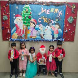 The most awaited festival of the year ‘CHRISTMAS’ was celebrated with great joy and happiness in the Pre Primary section. The corridor and classrooms were decorated with festoons. To add to the beauty, a crib depicting the birth of Jesus Christ was displayed in the Nursery class. A Christmas gift was given to all the children. They enjoyed the Christmas party by singing and swaying to the tune of Christmas carols. Santa Claus accompanied with little Santa from the Nursery class created a joyful atmosphere by visiting all the classrooms wishing everyone ‘Merry Christmas’, singing and dancing along, to the tune of the famous song ‘Jingle bells’. As a part of their activity for Christmas, Nursery children prepared headgear of reindeer, Jr.KG a christmas tree and Sr.KG a christmas bell.