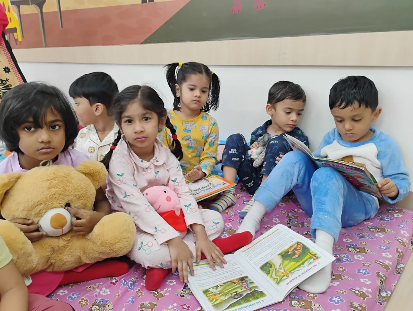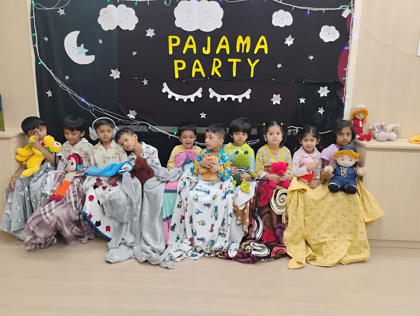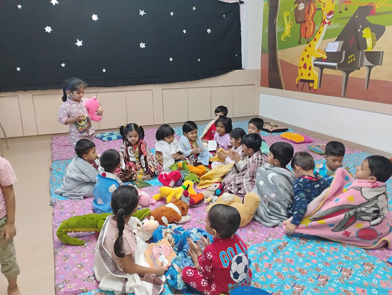 The classrooms were transformed into cozy bedroom settings with mattresses and bedsheets, creating a warm environment for the children. The kindergarteners arrived in their pajamas with their favourite soft toys and books. They enjoyed storytelling, browsing books, and fun games, making the day relaxing, joyful, and full of happy memories
