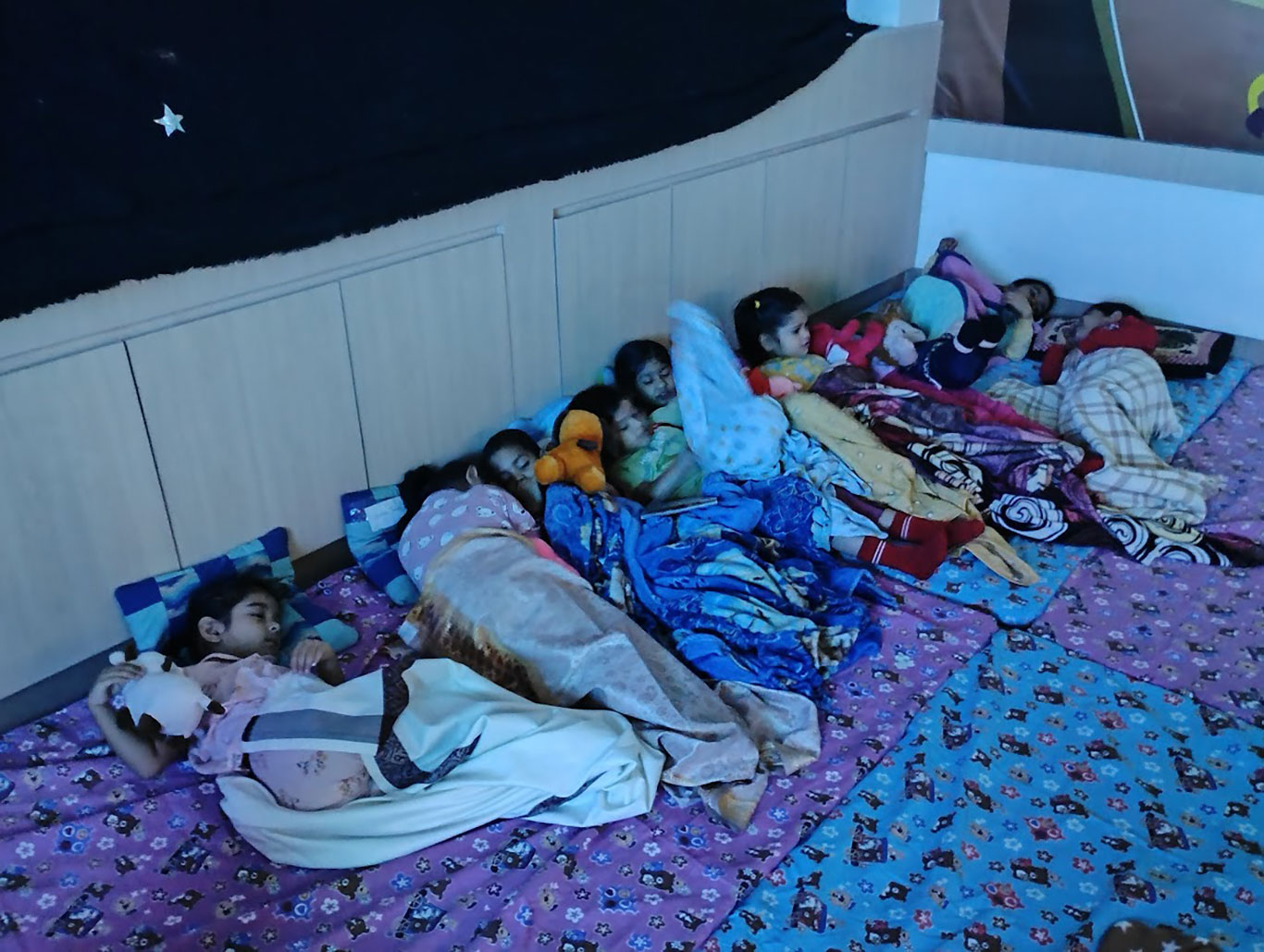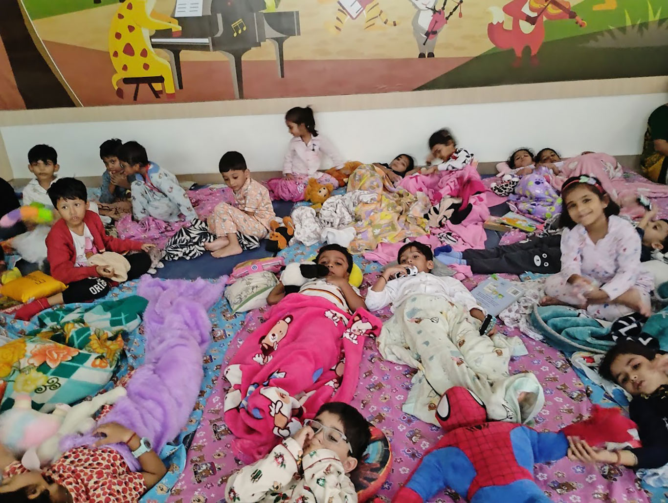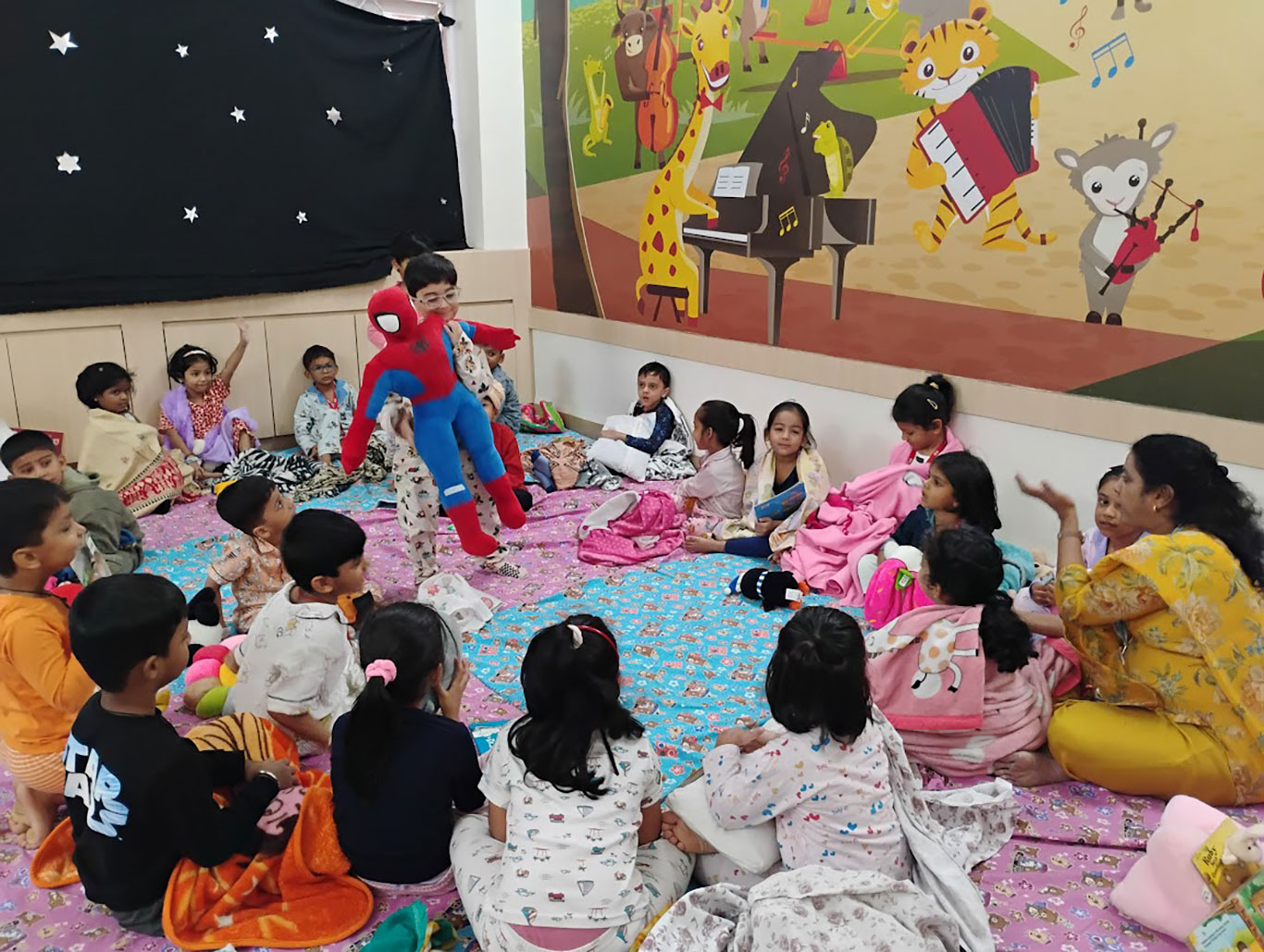 The classrooms were transformed into cozy bedroom settings with mattresses and bedsheets, creating a warm environment for the children. The kindergarteners arrived in their pajamas with their favourite soft toys and books. They enjoyed storytelling, browsing books, and fun games, making the day relaxing, joyful, and full of happy memories