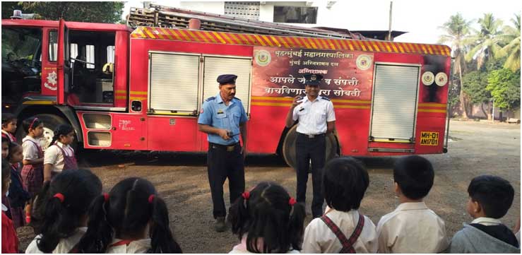 The school organized a field trip for the students to the Fire station at Bandra Reclamation as a part of our EVS curriculum. A brief introduction of the fire station was given by firefighters and information about different situations causing fire was shared. At the fire station, students were introduced to different techniques to extinguish the fire. They even saw a fire drill. The students gained knowledge about different types of fire extinguishers. Firefighters demonstrated different water hoses used for dousing the fire. Different parts of the Fire engine were shown. The children saw how the firemen dress up in their fireproof suit wearing the helmet, boots and face mask with the gas tank to douse the fire. The firemen interacted with our children. The children keenly responded to the number 101 to dial in case of an emergency. The students thanked the firemen for saving lives. It was indeed an enriching learning and fun filled experience for our students. The children learnt how to be courageous and serve the community.