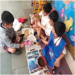 Children took on the role of little gardeners and sowed seeds in beautiful earthen pots. They truly enjoyed the activity with their friends as they dug the soil, raked it smooth and watered it gently and lovingly using the watering can. It was a wonderful experience for them as well as for the teachers to see the immense pride and wonder on their lovely faces as the shoots eventually came up.