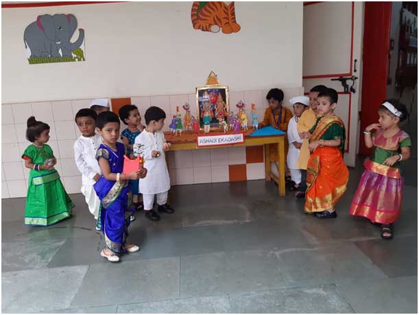 “Ashadhi Ekadashi was celebrated in school. An informative video on Ashadhi Ekadashi was shown to students from KG to Grade 10. Also a Dindi was performed by students.