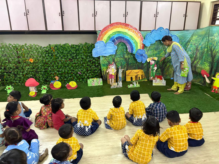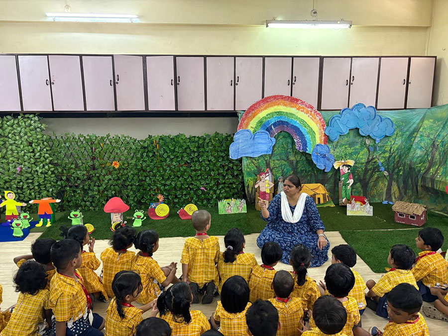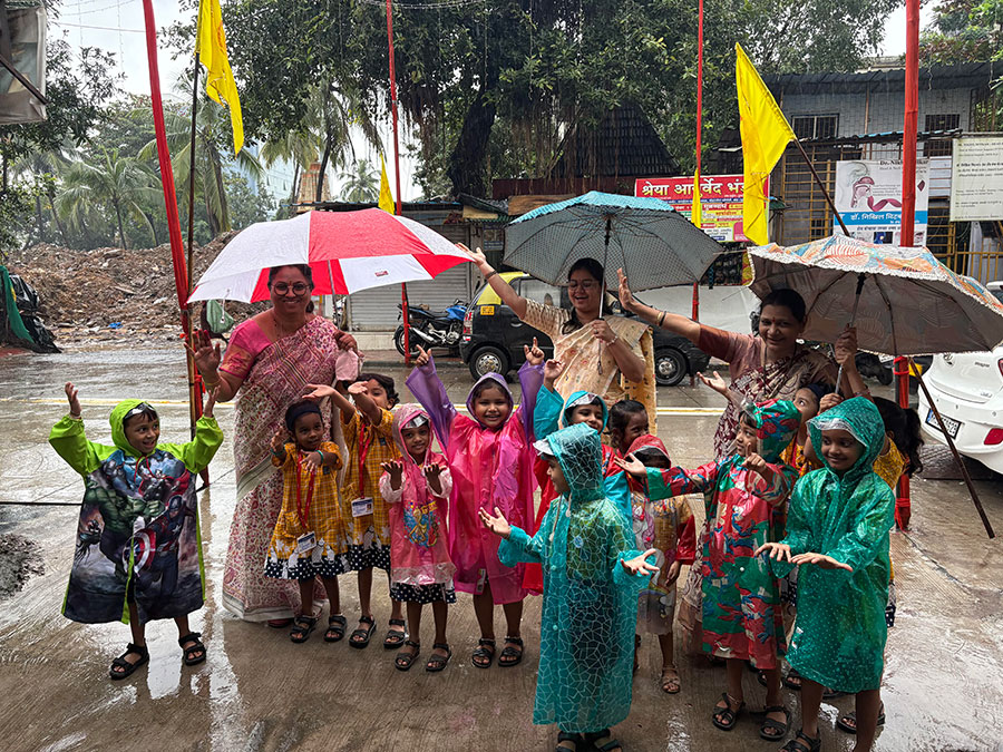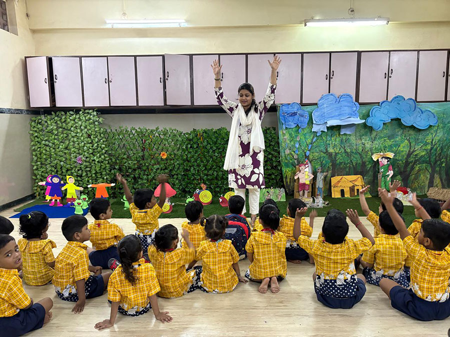 The rainy season is a very important and joyful season of the year. In the project room, a display was set up featuring clouds with raindrops, a rainbow, farmers working on the farm, children in rainwear, and various rainy season creatures. Through this project, children were able to understand and relate to the different aspects of the rainy season—things they see, experience, and observe in their surroundings.