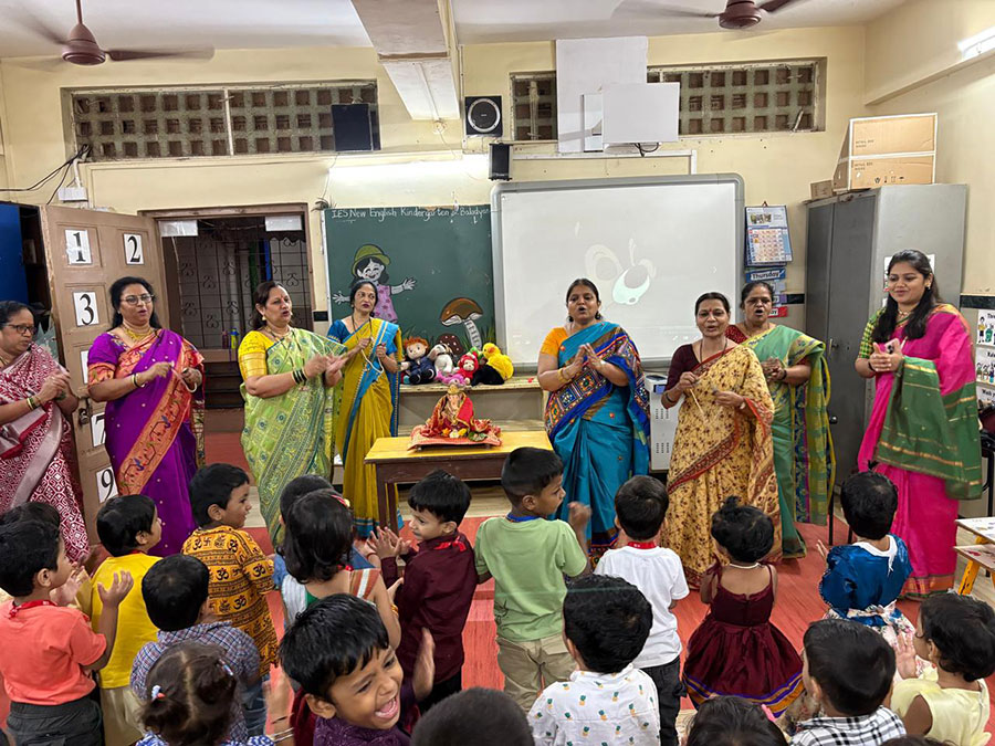 To encourage students' creativity and teach them traditional values, NEKG organized various activities to prepare for Ganesh Festival. Each child helped decorate Ganapati Bappa by creating collages with palm painting, paper tearing and twisting paper, and paper crumbling.
