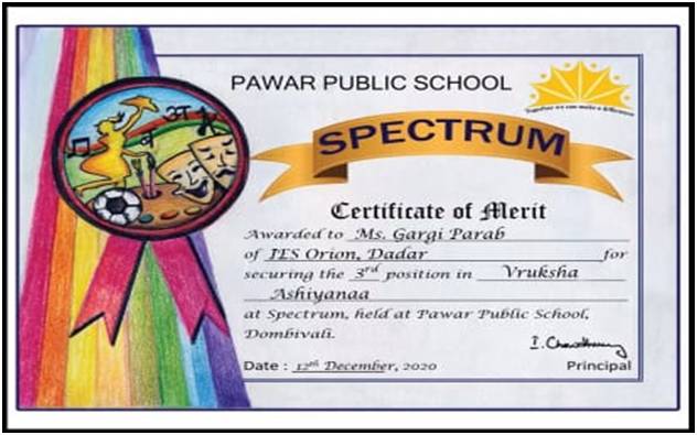 Miss Gargi Parab of Std VII Carnation secured the 3rd position in Vruksha Ashiyanaa online event organised by Pawar Public School, Dombivali on 12th December, 2020.