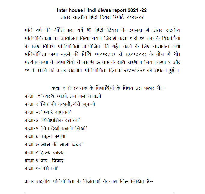 प्रति वर्ष की भाँति इस वर्ष भी हिंदी दिवस के उपलक्ष में अंतर सदनीय प्रतियोगिताओं का आयोजन किया गया। जिसमें किंडरगार्टन के नर्सरी (शिशु मंदिर), जूनियर केजी (कनिष्ठ केजी) और सीनियर केजी (वरिष्ठ केजी)के विद्यार्थियों के लिए विविध प्रतियोगिता आयोजित की गई। छात्रों के लिए नामांकन तथा प्रतियोगिता जमा करने की तिथि ०६/०८/२१ से १३/०८/२१ के बीच में थी। प्रत्येक विद्यार्थियों ने बड़े ही उत्साह के साथ सहभाग लिया।