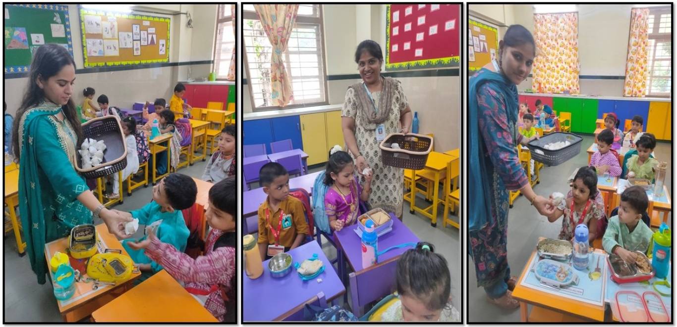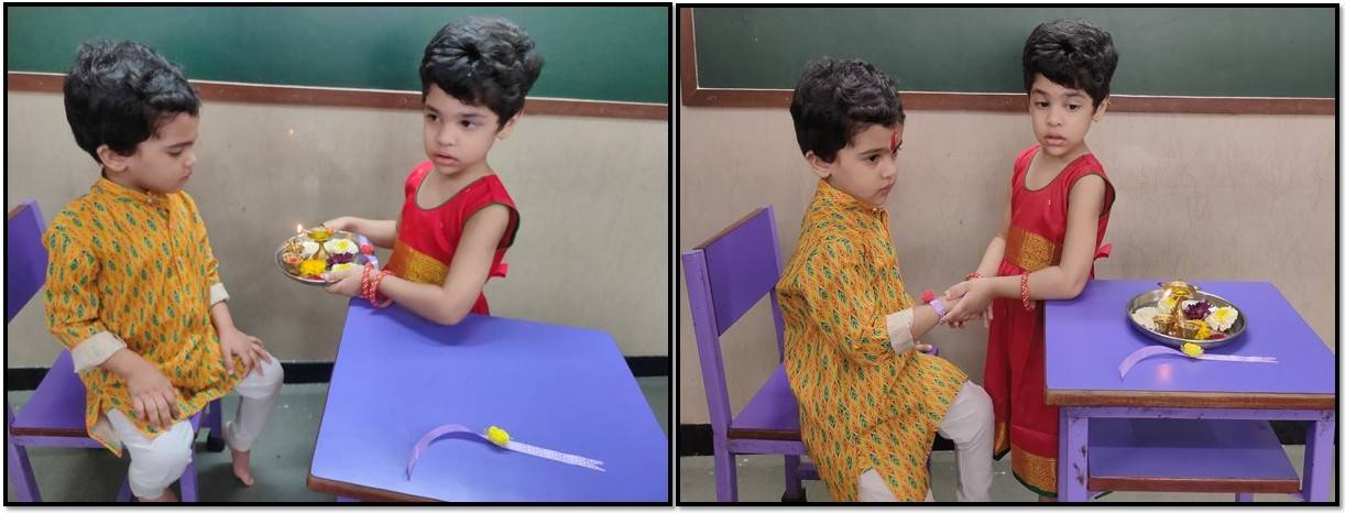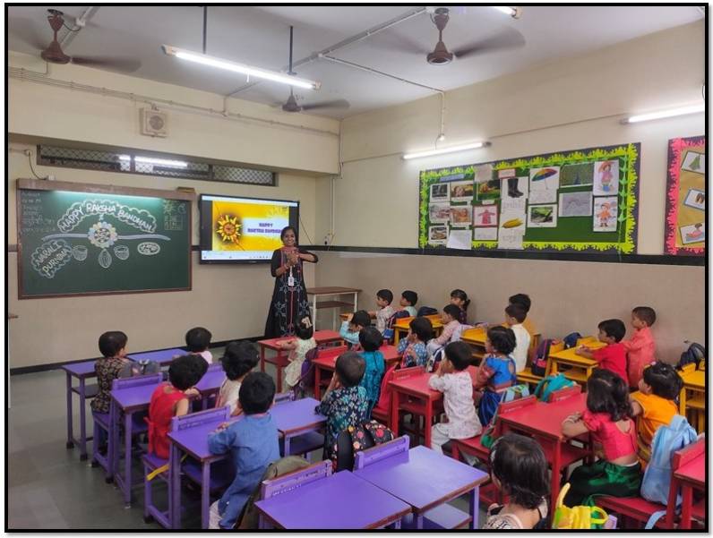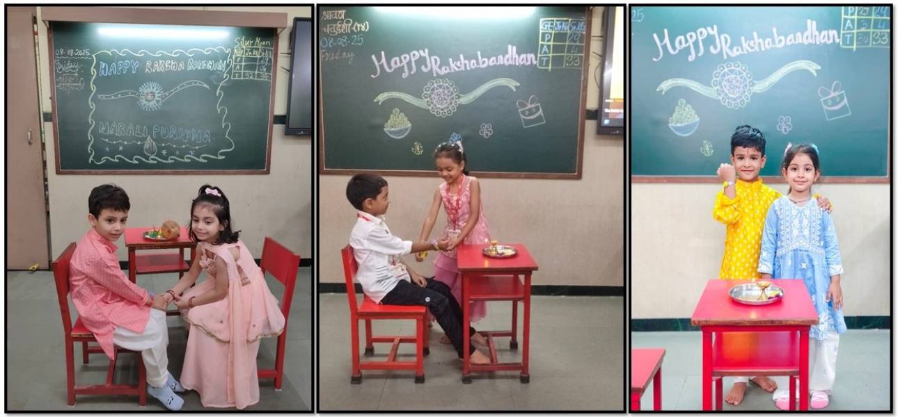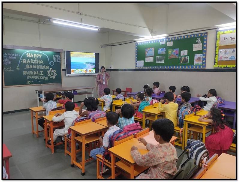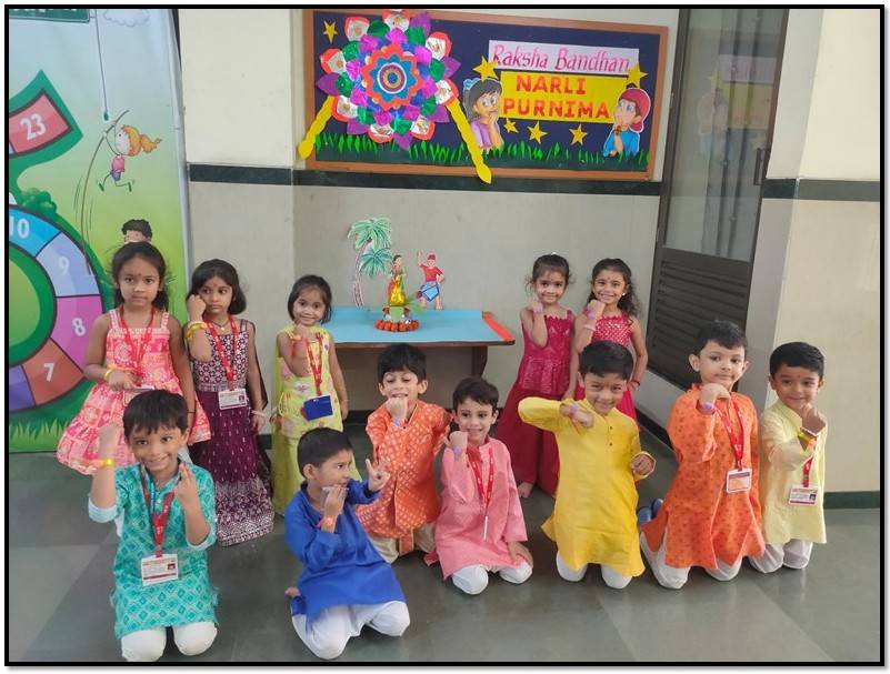 They swayed joyfully to Koli folk songs and Raksha Bandhan melodies, and relished the delicious Narali Barfi distributed to all. A special Rakhi making activity was conducted across classes, where students enthusiastically crafted colourful rakhis using different materials. Their handcrafted creations added an extra spark to the occasion.