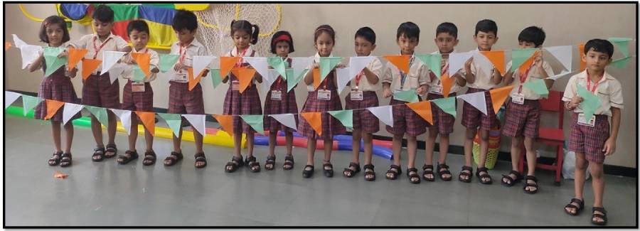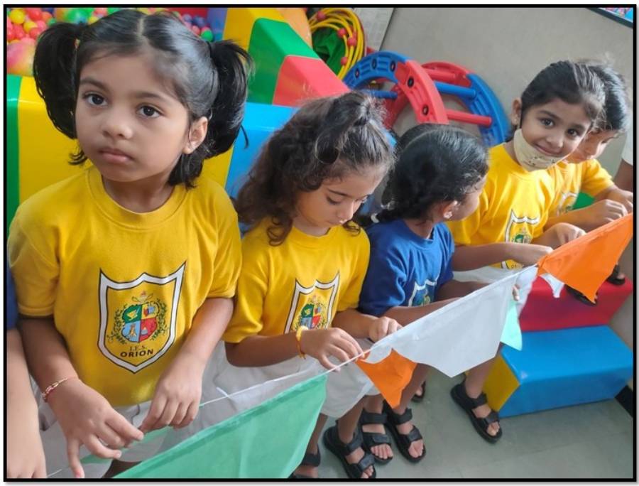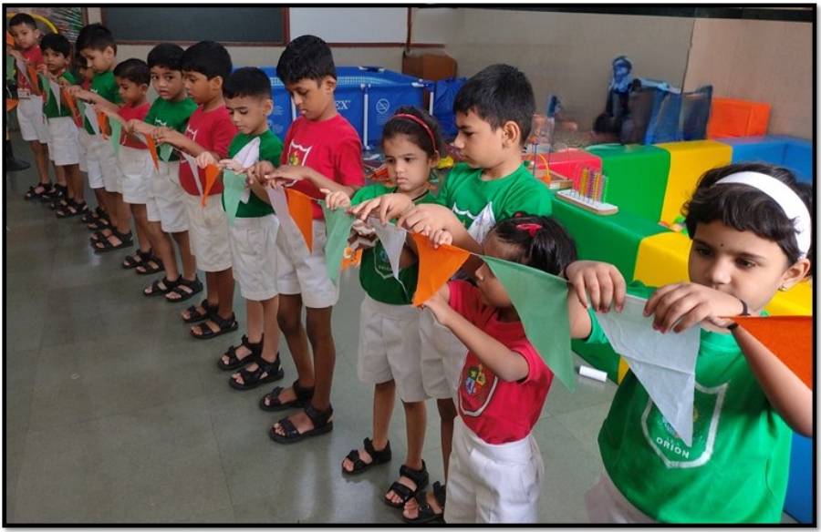 IES Orion Kindergarten celebrated the National Festival Independence Day on Thursday, 14th August 2025 with great enthusiasm and patriotic spirit. The Kindergarteners actively participated in making tri-colour buntings, which were used to beautifully decorate the school premises.