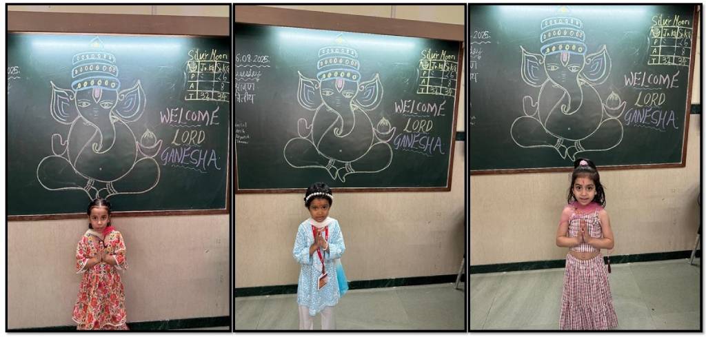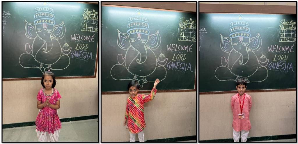 On Monday, 25th August 2025, students brought clay and decorative materials to craft beautiful Ganesha idols, which were displayed for class decoration and school projects. The celebrations continued on Tuesday, 26th August 2025, as children dressed in traditional attire sang devotional songs, recited shlokas, and enjoyed Prasad.