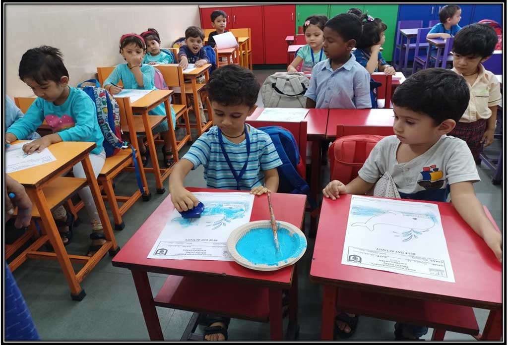 Students enjoyed doing finger painting with red paint on a cut-out of an apple for Red Day. For Blue Day students learnt sponge dabbing with blue paint on a picture of a whale. For Green Day students developed their fine motor skills by crumpling green crepe paper and sticking it on the picture of green peas. Yellow crepe paper was torn and stuck on a cut-out of a banana for theYellow Day. On Black and White Day cotton balls where stuck on the cut-out of a sheep by the students.