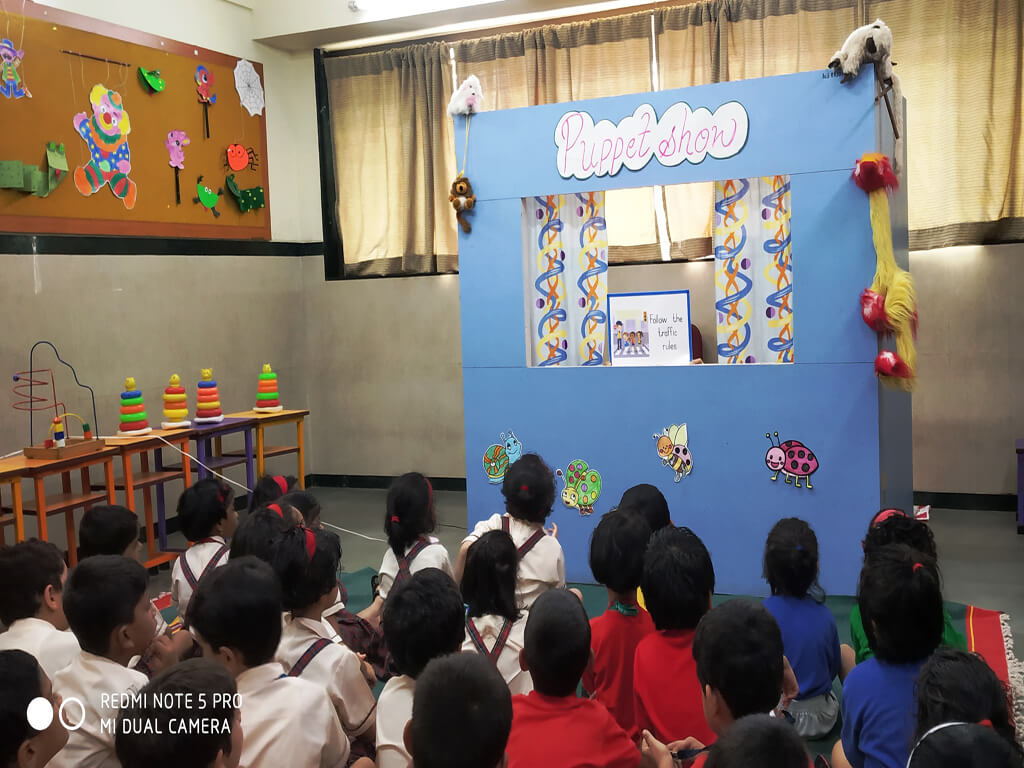 Sr.KG:A puppet show on ‘My School’ and the different areas of the school, disciplinary and safety rules, the mode of transport and the safety measures they should follow while travelling to school.