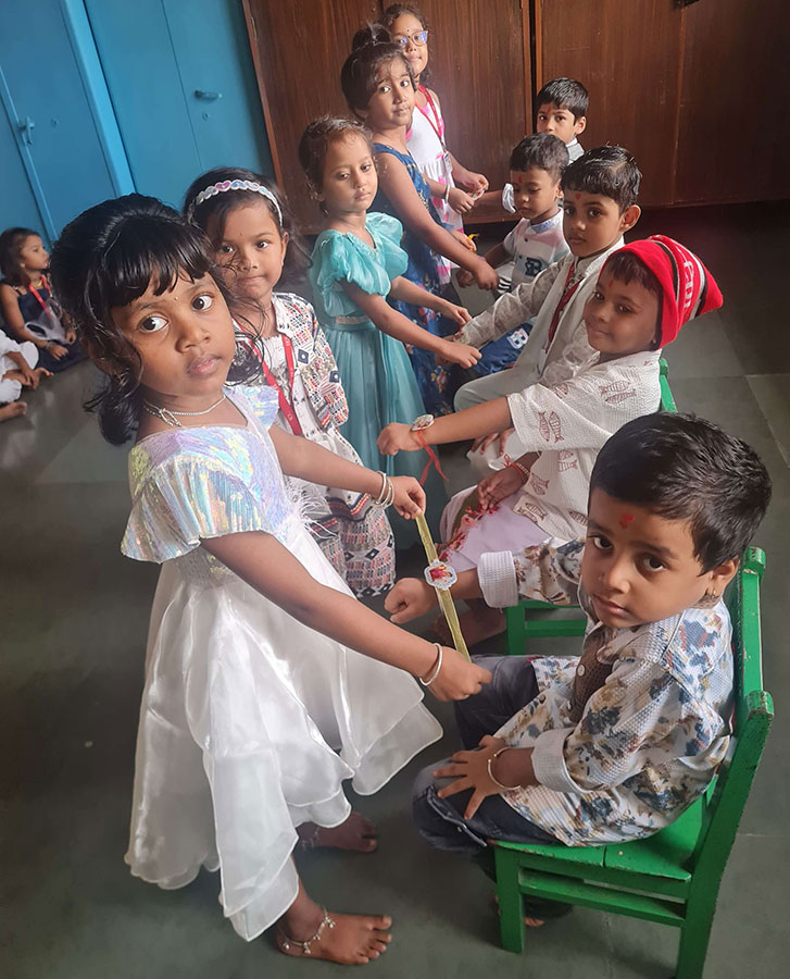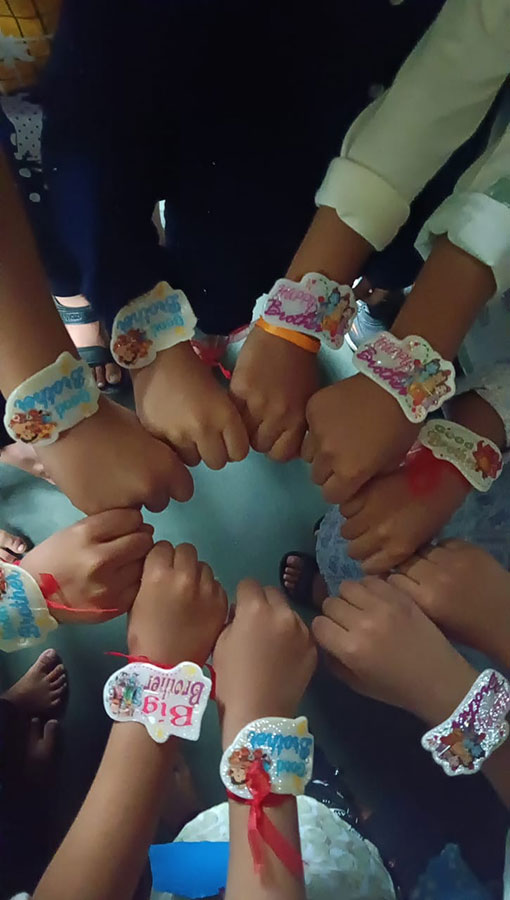 Children were distributed 'Rakhi and Naral Vadi.'
